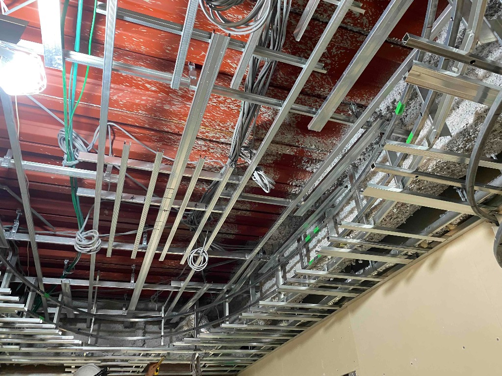 天井の場合は壁と異なり枠を吊り下げるため、使用する部品と工事の工程が多くなります。